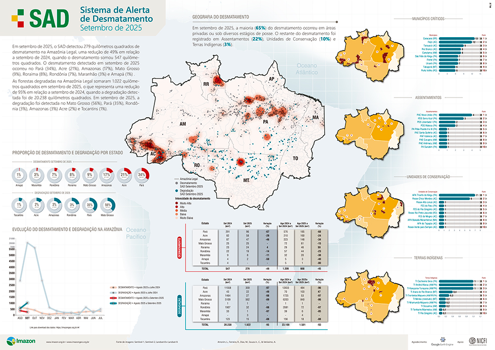 O programa também oferece capacitações a servidores públicos, estudantes universitários e à sociedade civil. Além disso, disponibiliza dados, boletins, relatórios técnicos e publicações científicas para democratizar o uso de geotecnologias. Por último, o programa contribui para o desenvolvimento e a avaliação de políticas públicas e de ações do setor privado voltadas à proteção e à restauração da Amazônia.