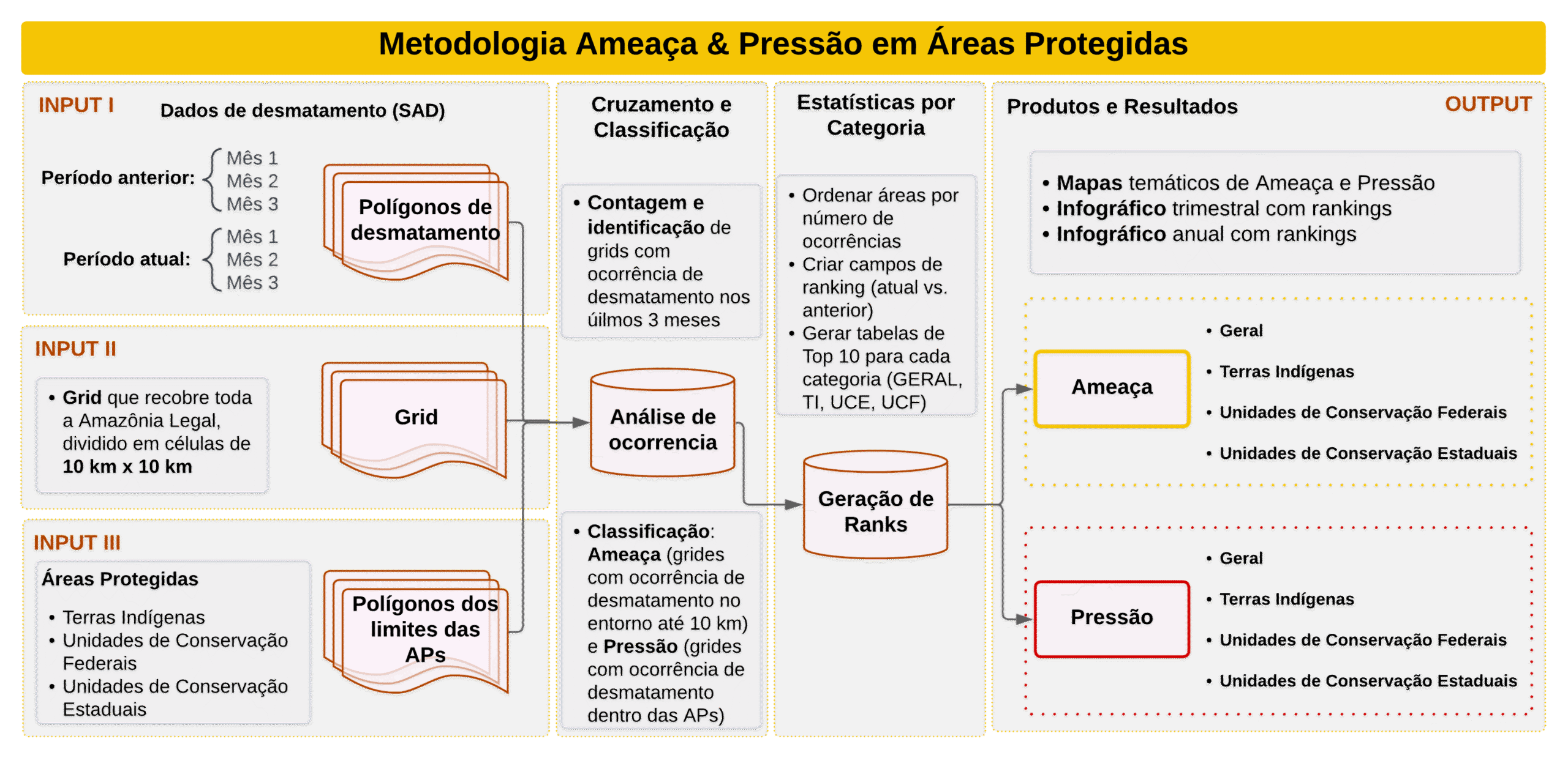 Áreas Protegidas (APs) representam um patrimônio nacional, e considerando a extensão das APs na Amazônia Legal (i.e., 4), os seus benefícios para a manutenção da biodiversidade, estoques de carbono e na geração de serviços ambientais, como a regulação do clima, transcendem a fronteira nacional, alcançando relevância global. Dada a importância das Áreas Protegidas (APs) como patrimônio ambiental, social e cultural, o relatório utiliza uma metodologia padronizada para identificar e comparar o grau de vulnerabilidade de diferentes territórios. A análise se baseia em dados recentes de desmatamento, que são cruzados com um grid que recobre toda a Amazônia Legal, dividido em células de 10 km x 10 km. Cada célula com ocorrência de desmatamento é contabilizada e associada ao território mais próximo.