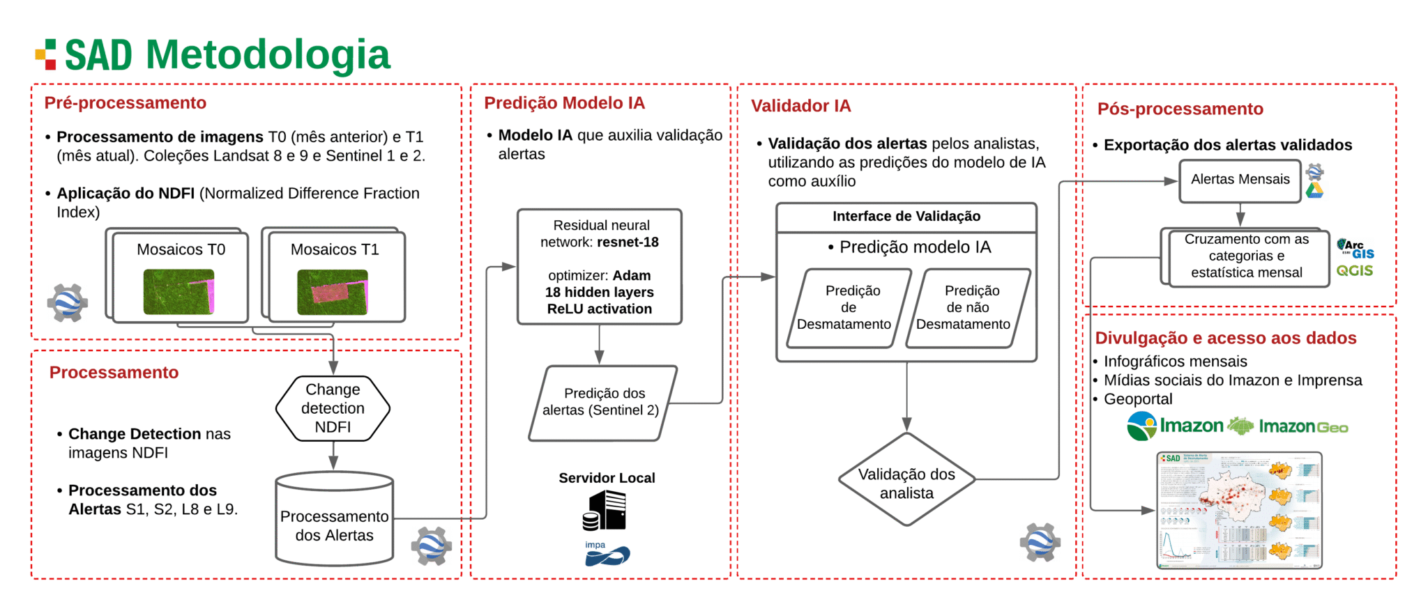 Desde agosto de 2023 o SAD utiliza inteligência artificial (IA) na validação dos alertas. Através de uma parceria do Imazon com o IMPA, foi desenvolvido um modelo de IA para auxiliar no processo de validação, que já economizou 24% do tempo de horas validadas. A criação desse algoritmo de IA ajuda na tomada de decisão em relação à classificação dos alertas de desmatamento e não desmatamento e, com isso, acelera e traz maior assertividade ao processo de monitoramento.